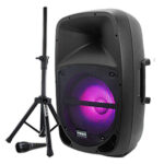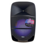 Cabina activa de 15″ Maxlin MX15E con 120 W RMS, tecnología Bluetooth, MP3, radio FM, luces LED, trípode, control remoto y micrófono. Potencia y versatilidad.