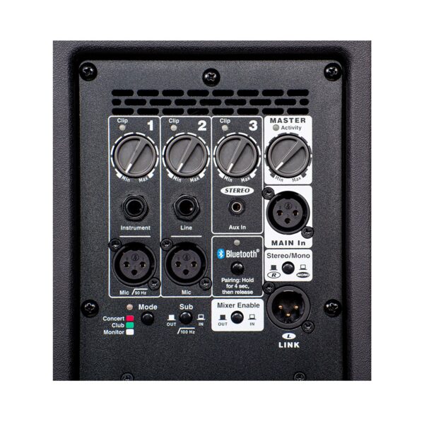Integra conectividad Bluetooth, permitiendo la reproducción inalámbrica desde dispositivos móviles, lo que facilita montajes rápidos y usos prácticos. Dispone de múltiples entradas XLR, ofreciendo mayor flexibilidad para conectar micrófonos, mezcladores u otras fuentes de audio, además de una salida XLR para enlazar más cajas activas.