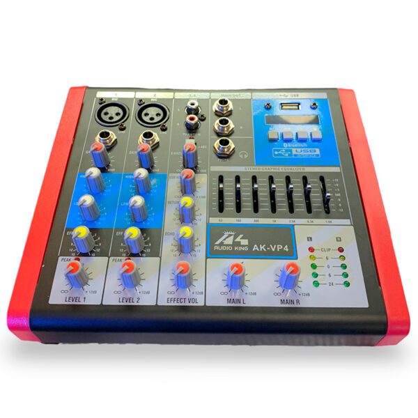 La Consola Audioking AK-VP4 es una solución de audio versátil y potente que satisfará tus necesidades de sonido. Con cuatro canales disponibles, este mezclador te permite conectar una variedad de fuentes de audio para mezclar y mejorar tu experiencia auditiva.