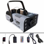 Máquina de humo PRY F1000-LED de 1000W con 6 luces LED RGB personalizables. Incluye control remoto alámbrico, inalámbrico y control de luces RGB. Ideal para discotecas, eventos y escenarios.