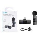 Micrófono inalámbrico Boya BY-V1 con transmisión de 360°, cancelación de ruido, y compatibilidad con dispositivos Apple iOS. Alcance de hasta 50 metros.