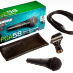 Micrófono vocal dinámico cardioide Shure PGA58XLR. Sonido claro para solistas y coristas. Incluye estuche, cable XLR y adaptador para pedestal.